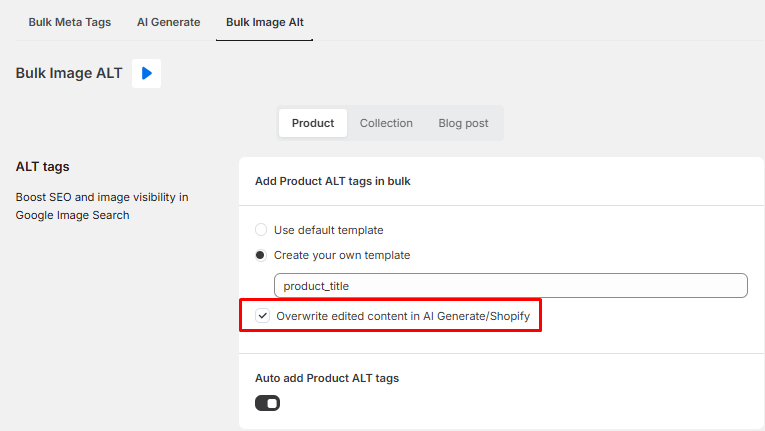 If you already add the ALT tags in Shopify or in our Manual Meta tags feature and now want to use the template to apply to all the ALT tags of your products, kindly choose to overwrite edited content in AI Generate/Shopify.