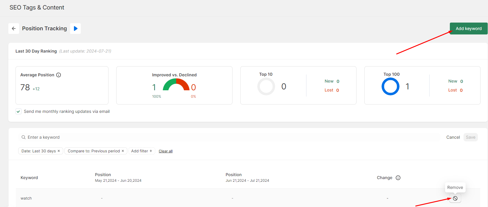 You can add more keywords to your tracking table by clicking on the **Add Keywords** button, or choose to delete the keywords by clicking on the Remove icon here.