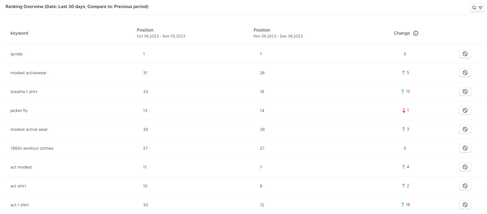 In the Ranking Overview, you can see a table showing the position and fluctuation of your keywords on top 100, compared to 2 periods of time.