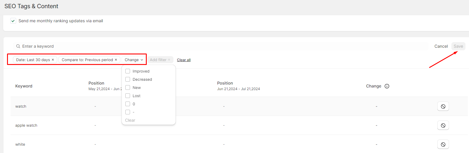 Besides, you can also use the filters here to change the time period you want to check. Plus, you can choose the status of your keywords change, or search the keyword that you want to check its position.
