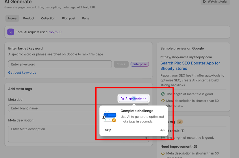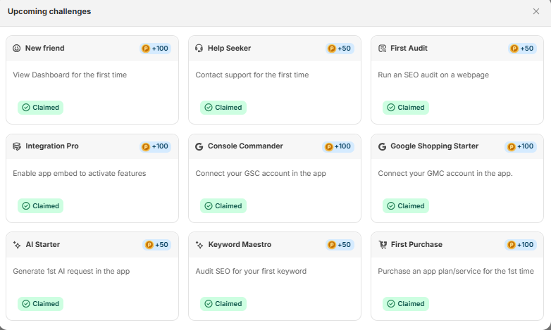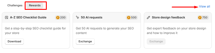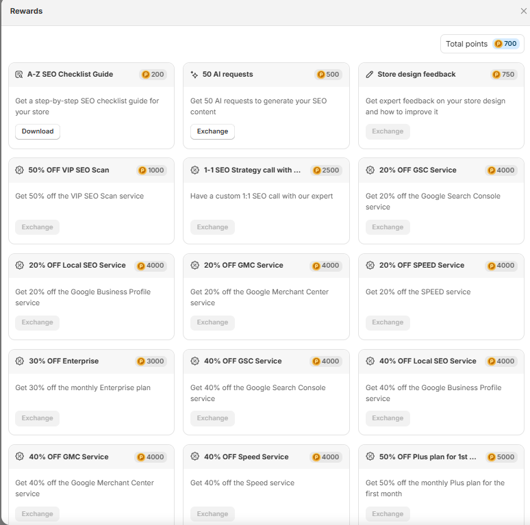 After accumulating Pie Points (🍰), you can begin redeeming them for our customized seo services. available options include the A–Z seo checklist guide, 50 AI requests, store design feedback, and more. To view the complete catalog of rewards, navigate to the Rewards tab.