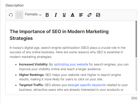 Let's go to our app's SEO Tags > AI Generation > Blog Post and start writing the Blog content, don't forget to repeat the keywords to 1% to 2% of the content.&#x20;