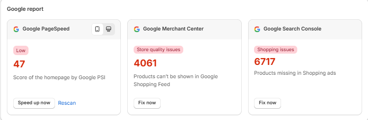 In the Google Report section, you will find key metrics that reflect your store’s SEO performance and product visibility on Google: